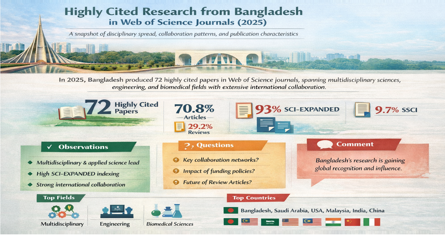 In 2025, Bangladesh produced 72 highly cited papers indexed in Web of Science journals, reflecting strong research visibility and international impact. The majority of these papers were published as original research articles (70.8%), with review articles contributing nearly one-third, indicating both knowledge generation and synthesis. These highly cited works span a wide range of disciplines, led by multidisciplinary sciences, engineering, environmental sciences, materials science, chemistry, and biomedical fields, highlighting the country’s growing interdisciplinary research strength. International collaboration is prominent, with strong co-authorship links involving Saudi Arabia, the USA, Malaysia, India, China, and several European and Asia-Pacific countries. Most papers were indexed in the Science Citation Index Expanded (SCI-EXPANDED), underscoring their placement in established, high-impact journals, while a smaller portion appeared in SSCI-indexed outlets. Overall, the data demonstrate Bangladesh’s increasing global research footprint and its ability to contribute influential work across diverse scientific domains. Web of Science