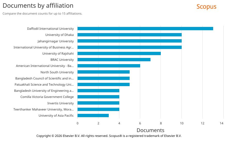 For the first time, National University of Bangladesh has appeared in the list of  institutes that has enough publications to be included in the list of top 160 research institutes.  National University of Bangladesh has obtained 132th position with 72 publications. All of  the publications are in English. All Open access 34, Gold 30, Hybrid 2 and Green 18. Top ten key words are Human (18), Article (9), Bangladesh (9),Adult (7), Female (7), Male (7),Humans (6), Sustainable Development (6), Artificial Intelligence(5) and Non human (5).
