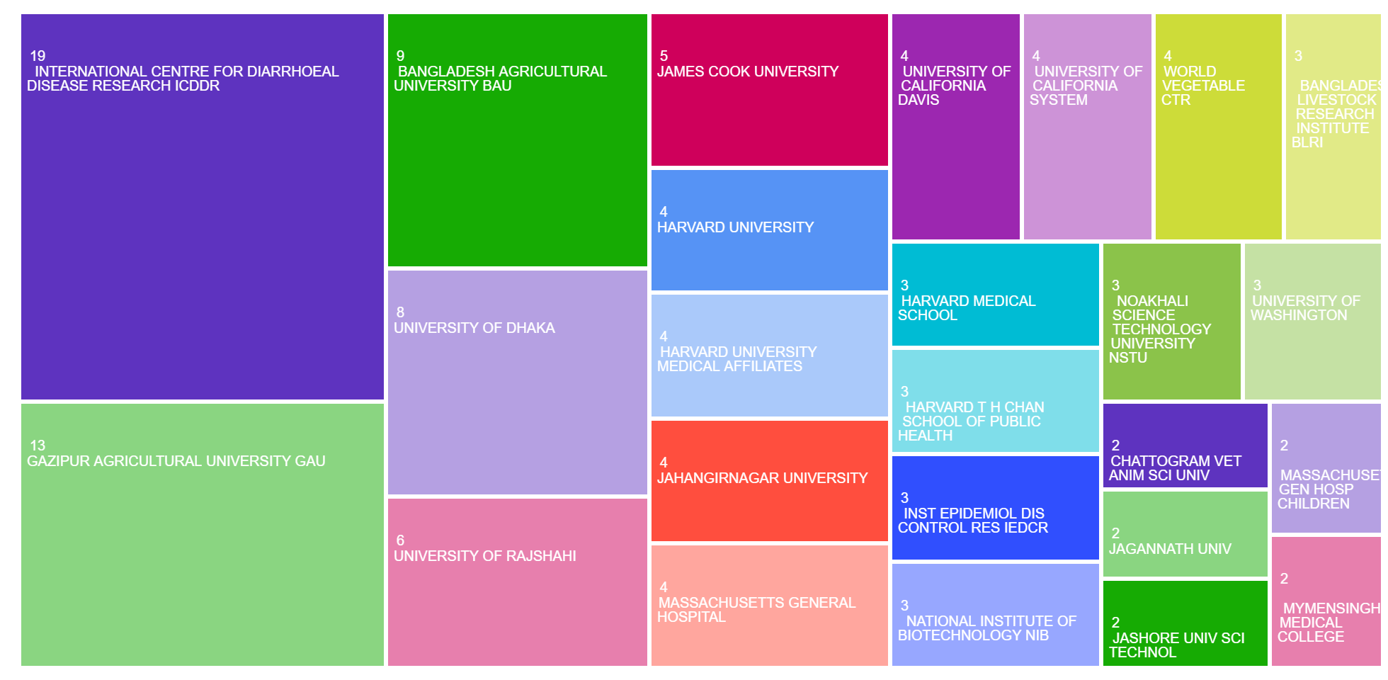 ICDDR leads as the primary institutional contributor, suggesting strong organizational research capacity.