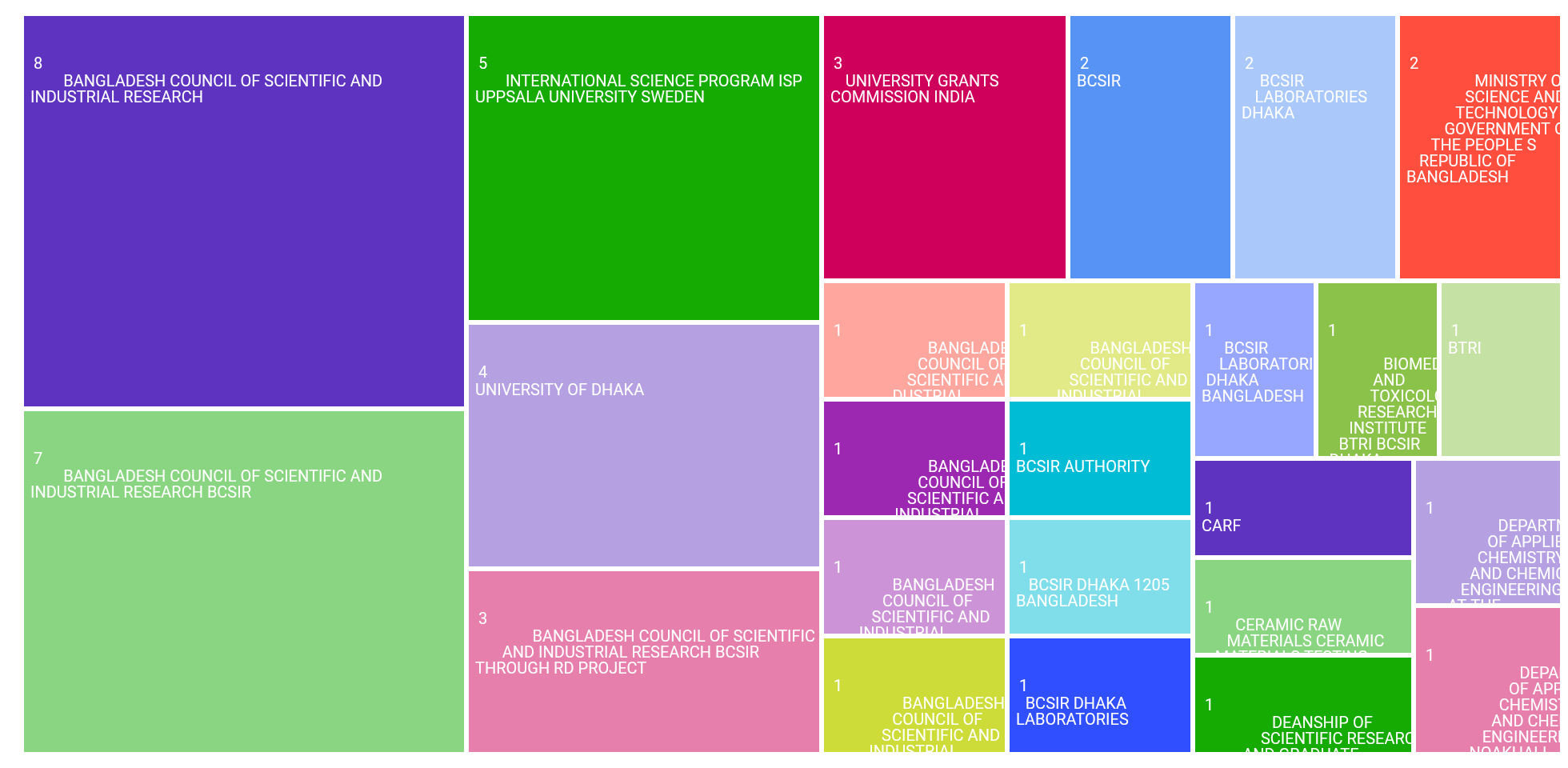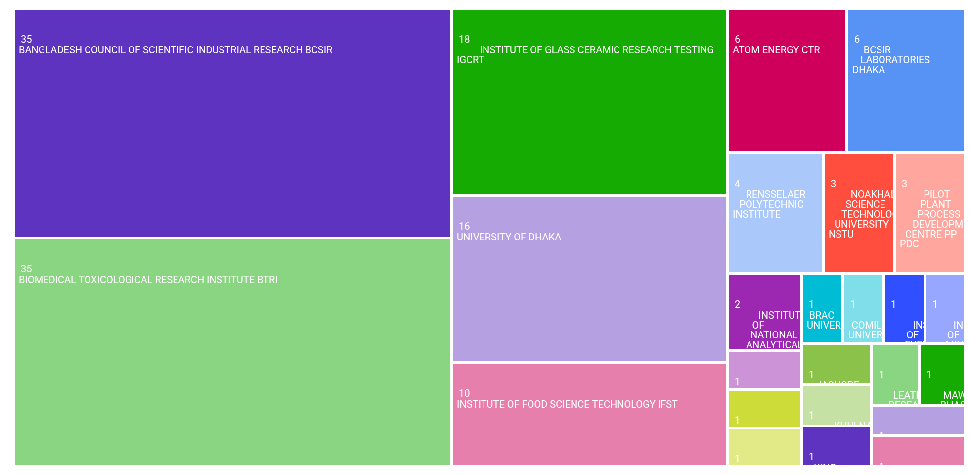 In 2024, the Biomedical and Toxicological Research Institute (BTRI) recorded 35 research publications indexed in the Web of Science, with all classified as articles and 2.86% as early access. The majority of works fall under “Chemistry Multidisciplinary” (28.57%), followed by “Materials Science Multidisciplinary” (20%) and “Food Science Technology” (17.14%). Elsevier is the leading publisher (42.86%), and 71.43% of the works are indexed in SCI-Expanded. Bangladesh accounts for all publications, with notable collaborations with the USA (14.29%), while prominent contributors include Dipa Islam (42.86%) and Md Sahadat Hossain (22.86%).