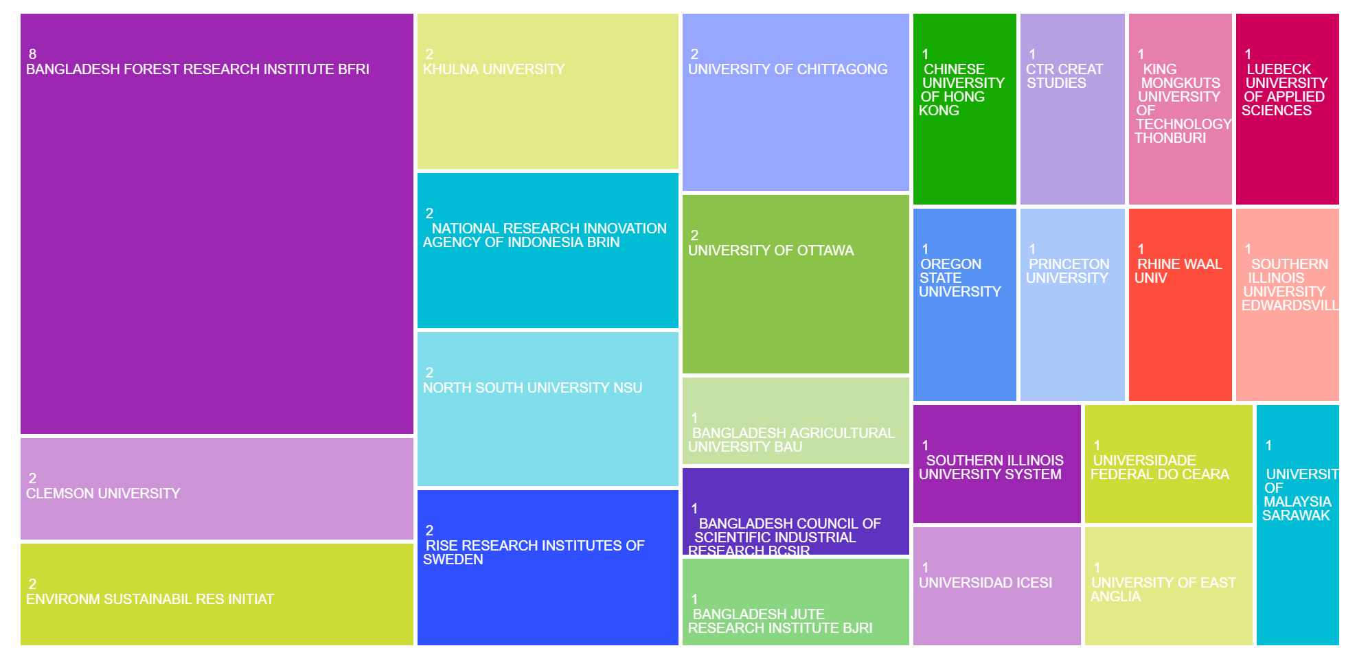 The Bangladesh Forest Research Institute (BFRI) published 8 research articles in 2024, covering a wide range of categories including Environmental Sciences, Forestry, Materials Science (Wood & Textiles), Meteorology, Genetics, Geosciences, and Sustainable Science. All publications were in article form, with multiple researchers contributing, reflecting a broad collaborative network. BFRI research engaged with international partners from the USA, Canada, Sweden, Indonesia, Brazil, China, and more, alongside strong domestic contributions. Publications were mainly hosted by Elsevier (62.5%), with additional donations in journals of the National Academy of Sciences, Taylor & Francis, and Wiley. Open-access played a significant role (5 of 8), while enriched citation references were found in 3 papers, showing global research visibility. Web of Science