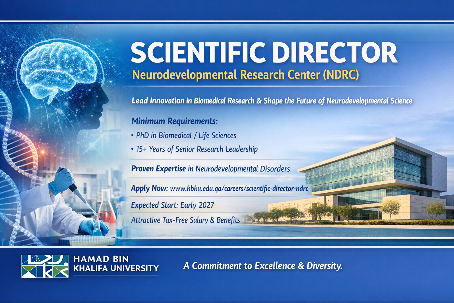 Hamad Bin Khalifa University (HBKU) invites applications for the prestigious position of Scientific Director at the Neurodevelopmental Research Center (NDRC). This leadership role offers a unique opportunity to drive impactful research, foster innovation, and contribute to global advancements in neurodevelopmental disorders. Science Careers