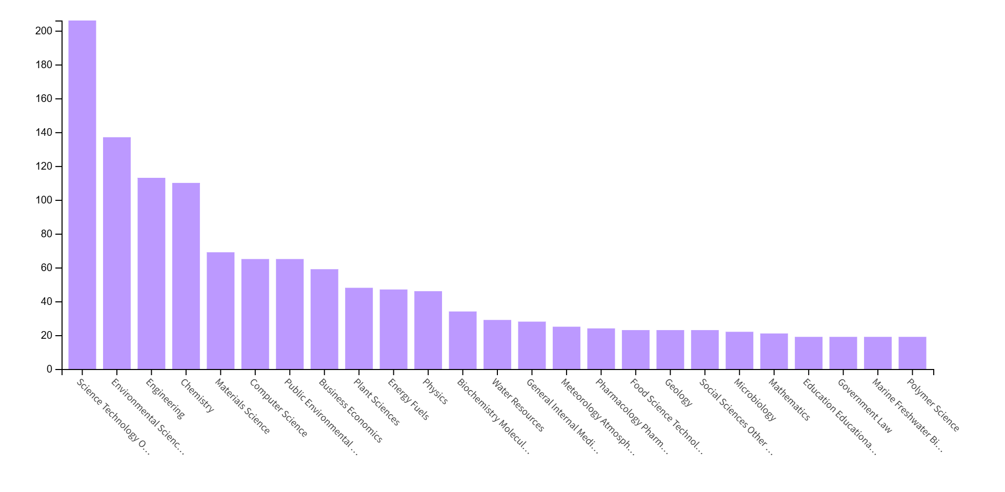 The dominance of multidisciplinary and environmental-related fields suggests alignment with global sustainability and public health research priorities.